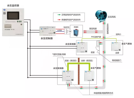 鑒于上述考慮,公安部消防科學(xué)研究所結(jié)合國際經(jīng)驗(yàn)提出余壓值的數(shù)據(jù)。壓差操控系統(tǒng)可通過操控旁通閥的開閉,將機(jī)械加壓送風(fēng)系統(tǒng)的余壓值有用操控在國標(biāo)要求的合理范圍內(nèi)-----防煙樓梯間40-50Pa,前室、合用前室、消防電梯間前室、封閉避難層(間)為25-30Pa。這樣既阻撓了有害煙氣的進(jìn)入,也確保了防火門在需求人員分散時(shí)能夠正常開閉。