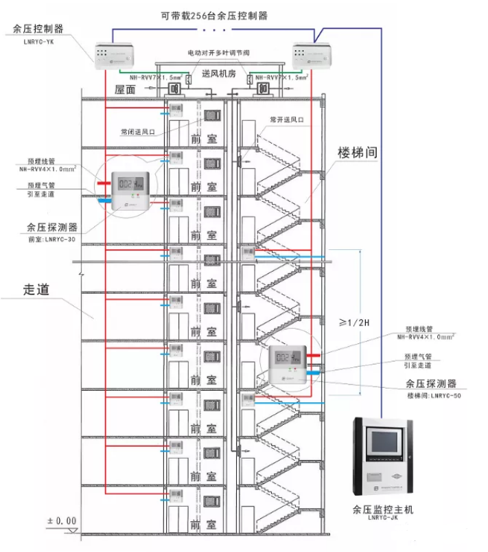 目的:是保持樓梯間和前室的余壓值維持在國家標準范圍,阻擋有害煙氣進入的同時,確保防火門的正常開啟,保證生命通道的暢通。